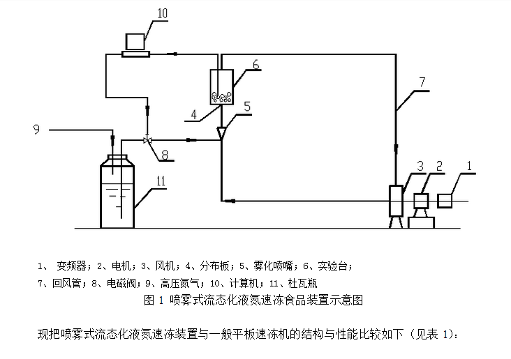 噴霧式流態化液氮速凍裝置就簡單得多(圖1),不需要壓縮機及蒸發器,冷凍裝置的致冷劑采用液氮噴淋汽化后提供,汽化氮氣在風管內循環使用以提高冷量的利用率,它主要由離心式風機、風管、布風板、變頻器、噴嘴、杜瓦瓶、高壓氮氣瓶以及計算機數據采集系統和處理系統組成。風機的轉速由變頻器輸出不同頻率的電流來實現對風機的無級調速。風機吹出的氮氣經導流后進入到布風板的下方,與從杜瓦瓶壓出經噴嘴霧化的霧狀液氮混合后,再通過布風板,把放在布風板上的食品吹起。低溫混合氣體與食品充分熱交換后溫度升高,**后經管道返回風機,完成一次循環。冷凍食品的冷量由液氮來提供,通過調節液氮的噴量來調節冷風的溫度,能滿足不同介質溫度的要求。計算機數據采集系統主要由溫度傳感元件(銅-康銅熱電偶)、A/D模數轉換器、信號放大器、壓力傳感器、風速儀以及高性能計算機等組成。溫度由熱電偶傳送到信號放大器,放大后的電信號進入A/D模數轉換器轉換成數碼信號后進入到計算機并口錄入溫度值。同樣裝置的壓力由壓力傳感器變為電信號經放大器、A/D模數轉換器后進入計算機錄入壓力值。熱風速儀采集風速后經輸出口輸出到計算機。