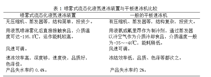 液氮的沸點是-195.8℃,比液氨(-33℃)和氟里昂(-30~-40℃)的沸點要低得多,當霧化的液氮與食品直接接觸時,以超過200℃的溫差進行激烈的熱交換,所以凍結速度極快,比一般的凍結方法快30~40倍,相應的每小時凍結量就有顯著提高。 3.2 質量好